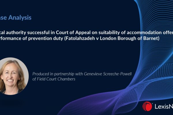 LexisNexis publishes a case analysis of Fatolahzadeh v London Borough of Barnet, in which Genevieve Screeche-Powell acted for the local authority that successfully defended a section 204 of the Housing Act 1996 (HA 1996) appeal brought by a homeless applicant. The case raised the following important points of principle: (i) whether parliament intended an alleged breach of the ‘new’ HA 1996, s 189A duties totally invalidate any subsequent decision to fulfilling its duty to secure suitable accommodation; (ii) the significance of the role of the s. 202 review process in curing alleged deficiencies.